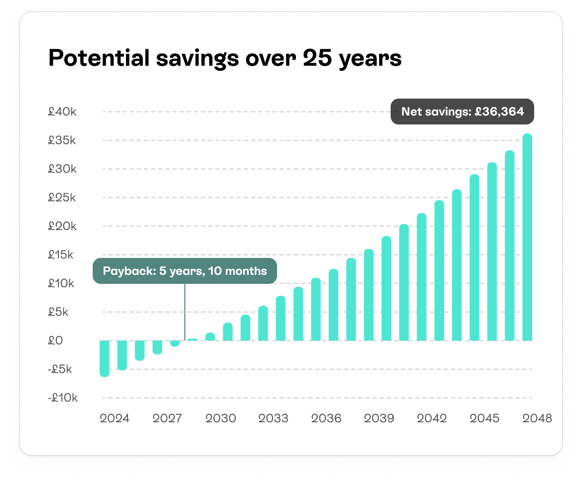 Over the first 25 years of having the system, you could save £36,364 and pay back the cost in as little as six years — after this, you’ll be making pure profit.